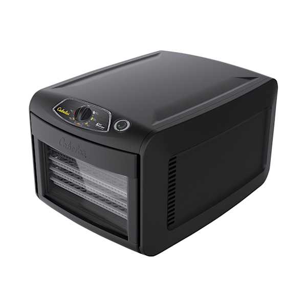 Crank out lots of delicious, dried fruit and vegetable snacks and jerky at home with Cabela’s Heavy-Duty 6-Tray Dehydrator. The dehydrator’s powerful, rear-mounted, 800W heater and fan force hot air horizontally across each individual tray towards the core to ensure even, consistent drying eliminating the need to rotate trays during the cooking process. High-capacity design offers 1,022 sq. in. of cooking space over 6 trays. The adjustable thermostat delivers precise dehydration temperatures between 80-160F. A fold-down door with magnetic closure and clear acrylic viewing window let you monitor cooking without opening the door and disturbing the consistent internal temperature. Durable polypropylene trays won’t get brittle, ensuring years of use. Removable drip tray and drying trays make cleanup quick and simple. Comes with a quick-reference guide. 20.5″L x 14.4″W x 11.8″H. Weight: 14.25 lbs. High-capacity dehydrator for home use Powerful, rear-mounted, 800W heater and fan Force hot air horizontally across trays towards the core No tray rotation needed 1,022 sq. in. of cooking space over 6 trays Adjustable thermostat – precise temperatures between 80-160F. 6 heavy-duty polypropylene trays
