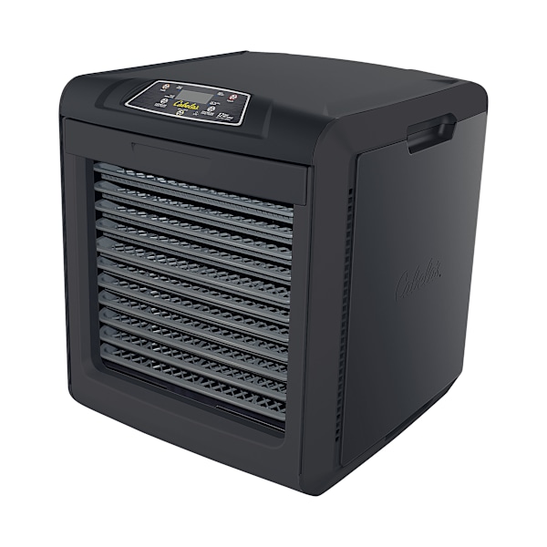 Get the power and capacity to fix big batches of delicious, dried fruit and vegetable snacks and jerky at home with the Cabela’s Pro Series 12-Tray Dehydrator. A powerful, rear-mounted, 1,100W heater and 6.5″ paddle fan force hot air horizontally across each individual tray towards the core to ensure even, consistent drying eliminating the need to rotate trays during the cooking process. High-capacity design offers 2,525 sq. in. of cooking space over 12 trays. The adjustable thermostat delivers precise dehydration temperatures between 80-160F. A fold-down door with magnetic closure and clear acrylic viewing window let you monitor cooking without opening the door and disturbing the consistent internal temperature. Durable polypropylene trays won’t get brittle, ensuring years of use. Side-mounted air slots exhaust heated air outward. Removable drip tray and drying trays make cleanup quick and simple. Built-in handles for easy carry. Comes with a quick-reference guide. 20.7″L x 18.2″W x 20″H. Weight: 24.5 lbs. High-capacity dehydrator for home use Powerful, rear-mounted, 1,100W heater and 6.5″ paddle fan Force hot air horizontally across trays towards the core No tray rotation needed 2,525 square inches of cooking space over 12 trays Adjustable thermostat 12 heavy-duty polypropylene trays Side-mounted air slots Removable drip tray and drying trays Built-in handles